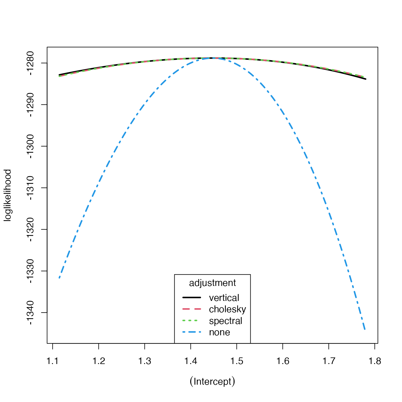 Note that for one free parameter, the Cholesky and the spectral adjustments are identical, and the vertical adjustment only deviates slightly at the edges of the plot.